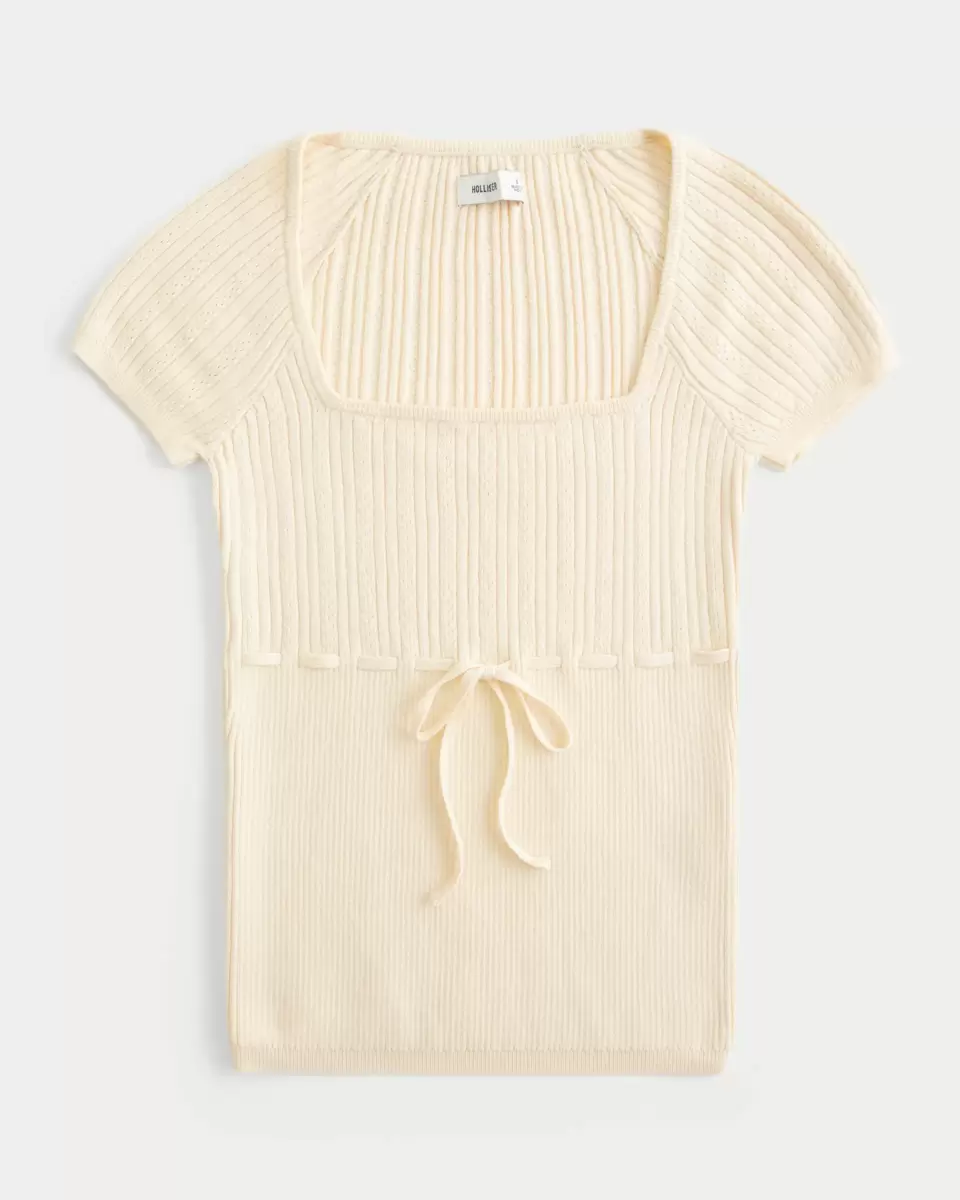 Cute and super soft, this short-sleeve sweater features ribbed texture and a tie detail through the waist. Square neckline. Imported.