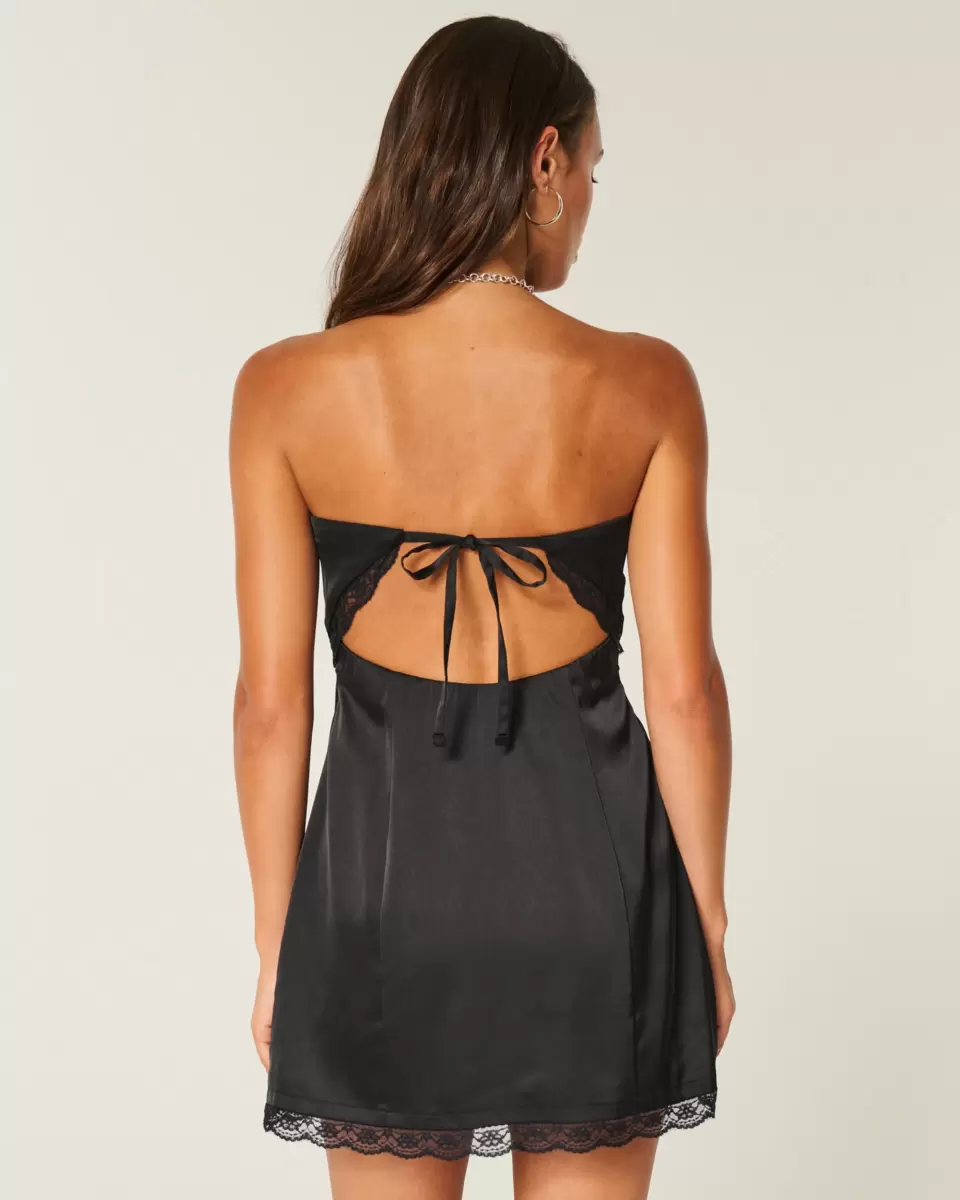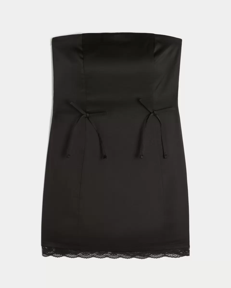 This super pretty dress is made with soft satin fabric and features bow details. Strapless, pretty lace trim at the hem, bodycon silhouette. Imported.