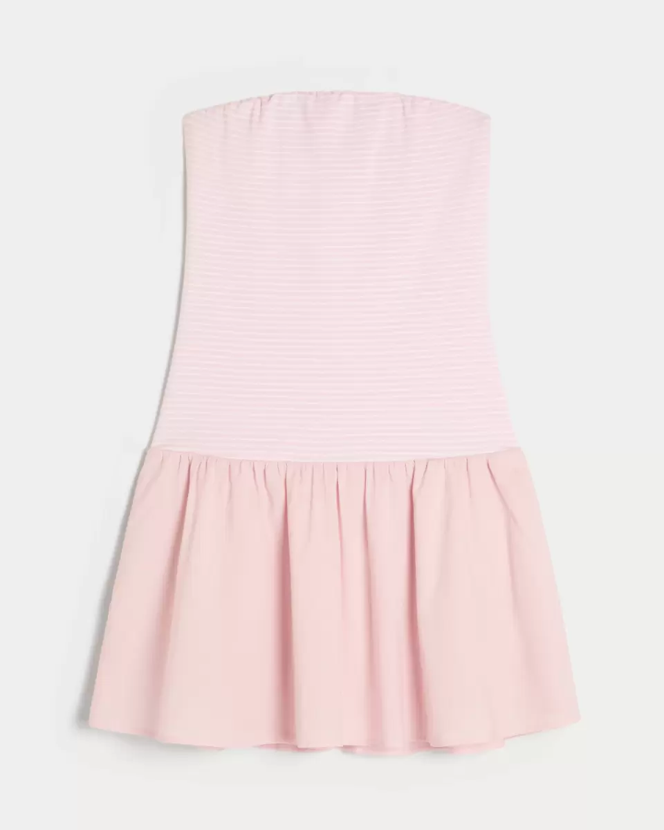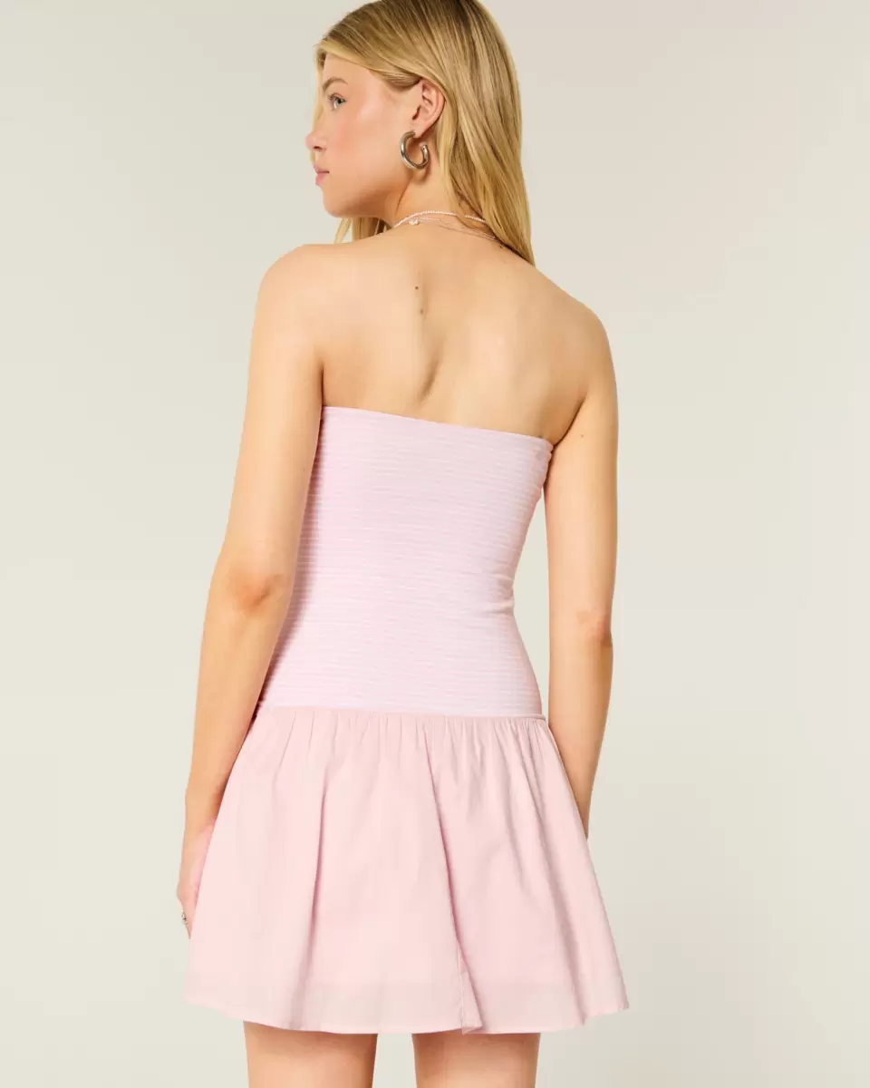 A super comfy strapless drop-waist mini dress with a soft and stretchy cotton blend bodice and a flowy woven blend skirt. Built-in shorts, pockets. Imported.