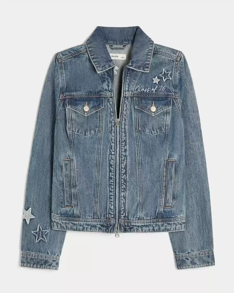 A classic denim jacket featuring Class of ’26 graphic embroidery at the left chest and star applique at the right sleeve. Full zip-up closure, collar, chest pockets, front pockets. Imported.