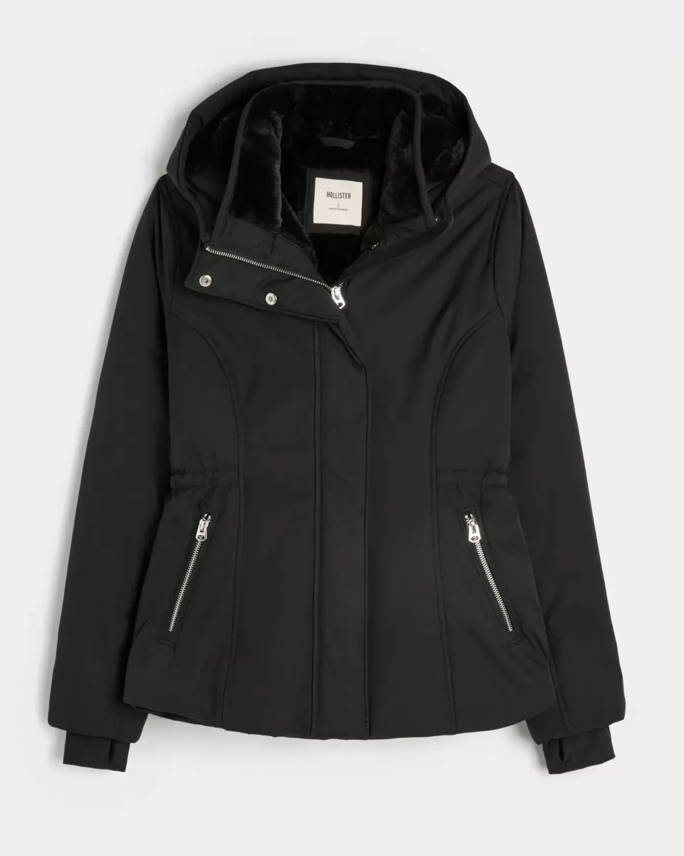 This super comfortable jacket features cozy faux fur lining, a full zipper closure with snaps and a faux fur-lined hood. Front zipper pockets, storm cuffs with thumb openings. Imported.
