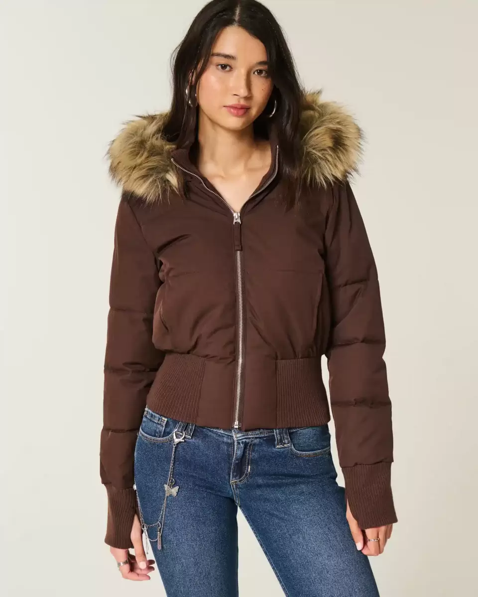 A cozy puffer bomber jacket designed with quilted channels, banded hems and a faux fur-trimmed hood. Mock-neck collar, thumb openings at sleeve cuffs, full zip-up closure, pockets. Imported.