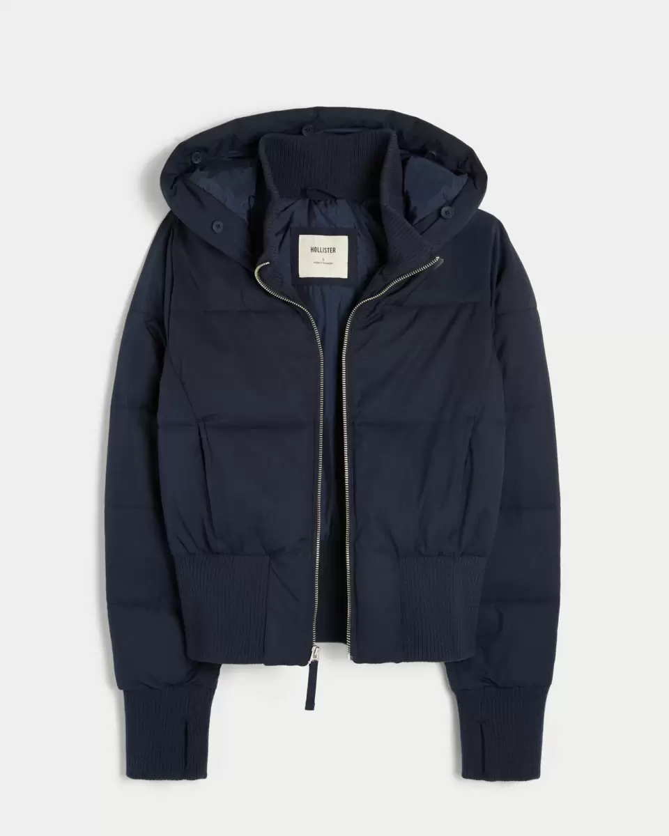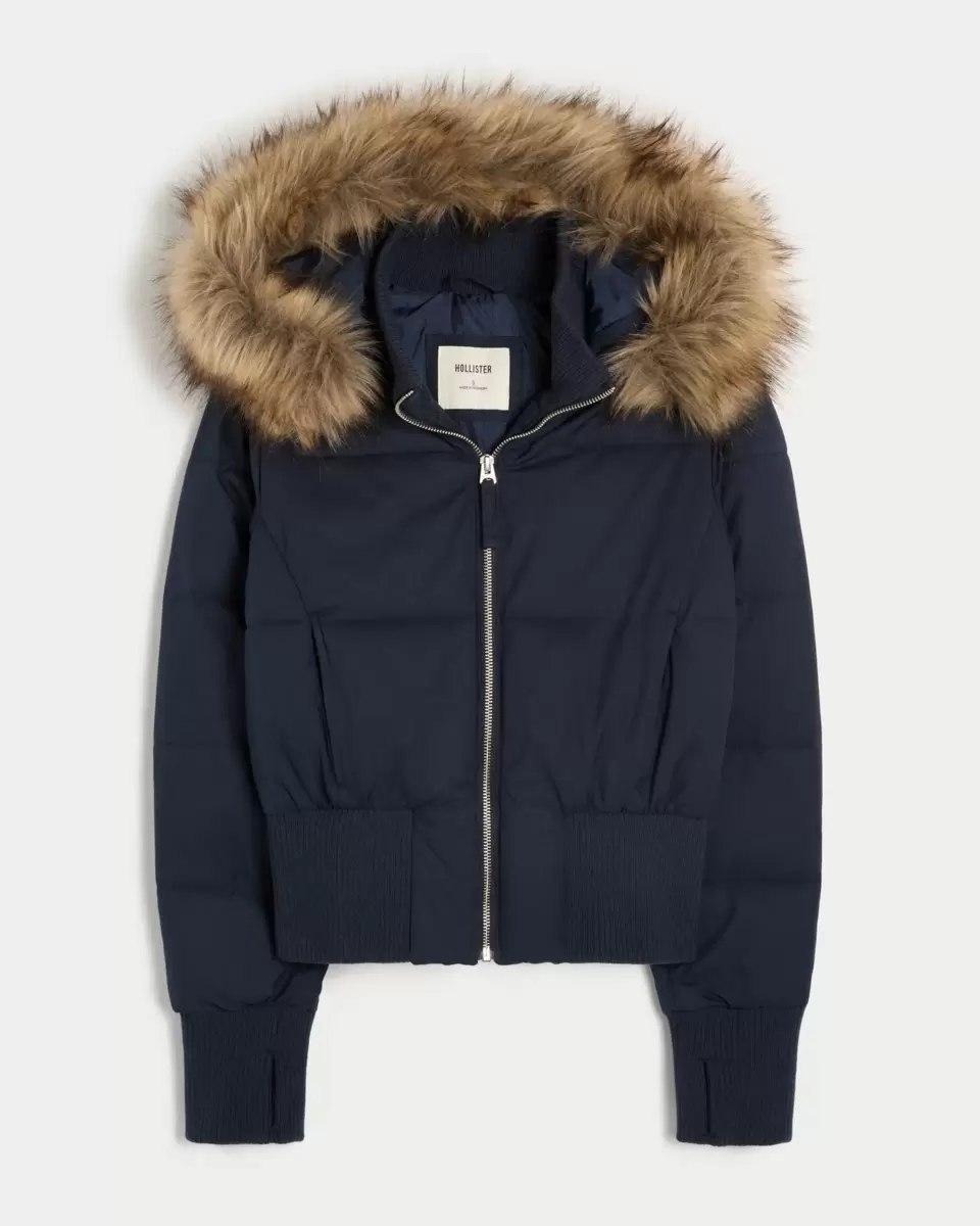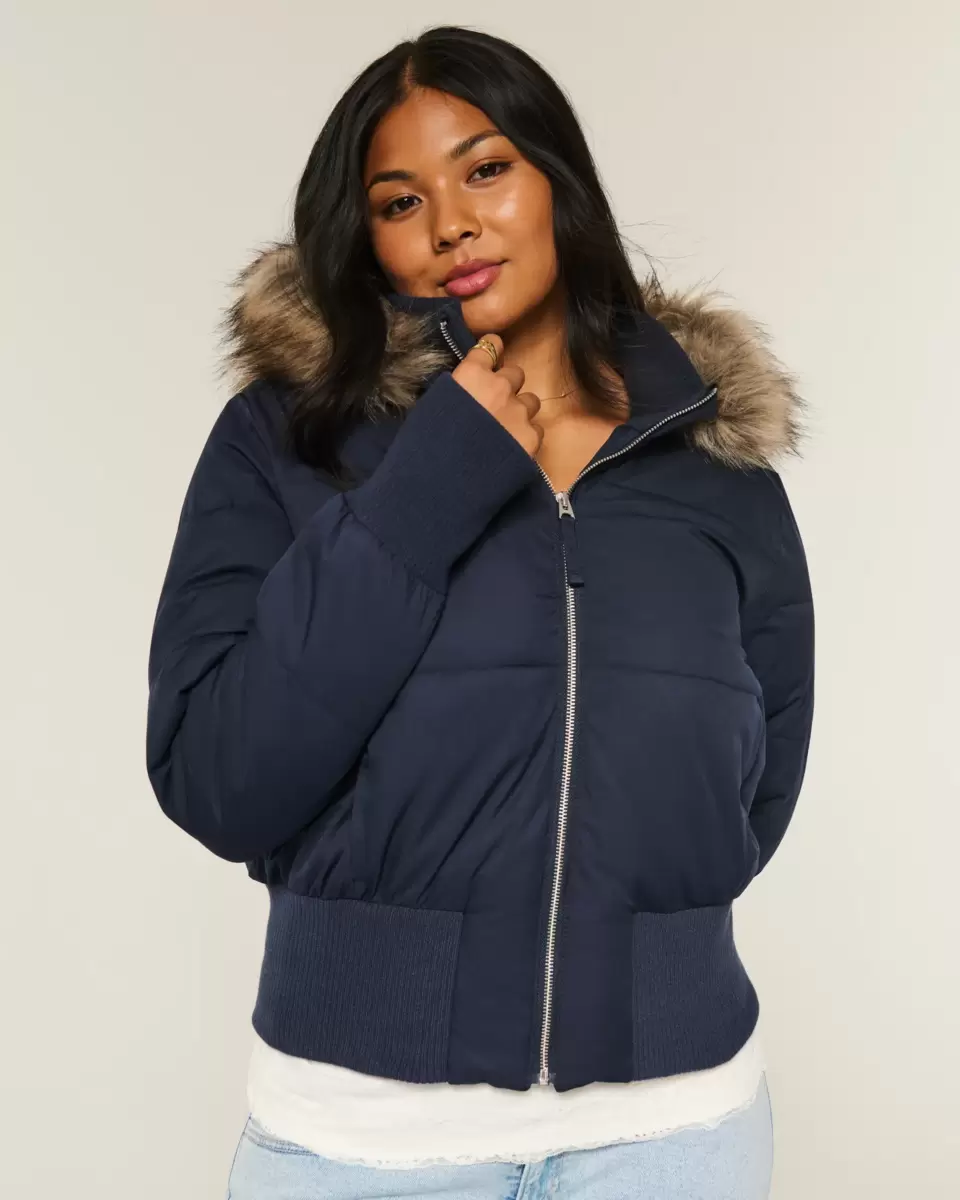 A cozy puffer bomber jacket designed with quilted channels, banded hems and a faux fur-trimmed hood. Mock-neck collar, thumb openings at sleeve cuffs, full zip-up closure, pockets. Imported.