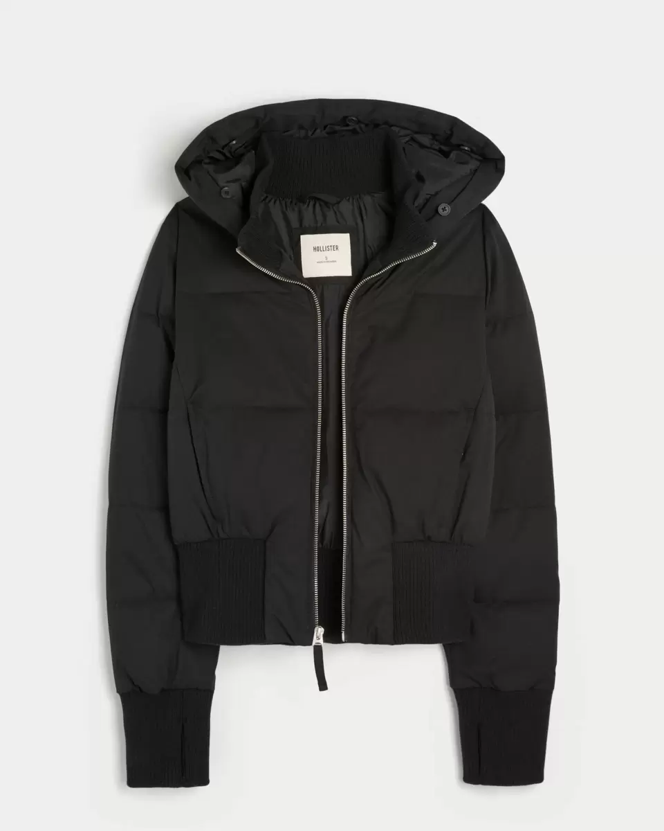 A cozy puffer bomber jacket designed with quilted channels, banded hems and a faux fur-trimmed hood. Mock-neck collar, thumb openings at sleeve cuffs, full zip-up closure, pockets.