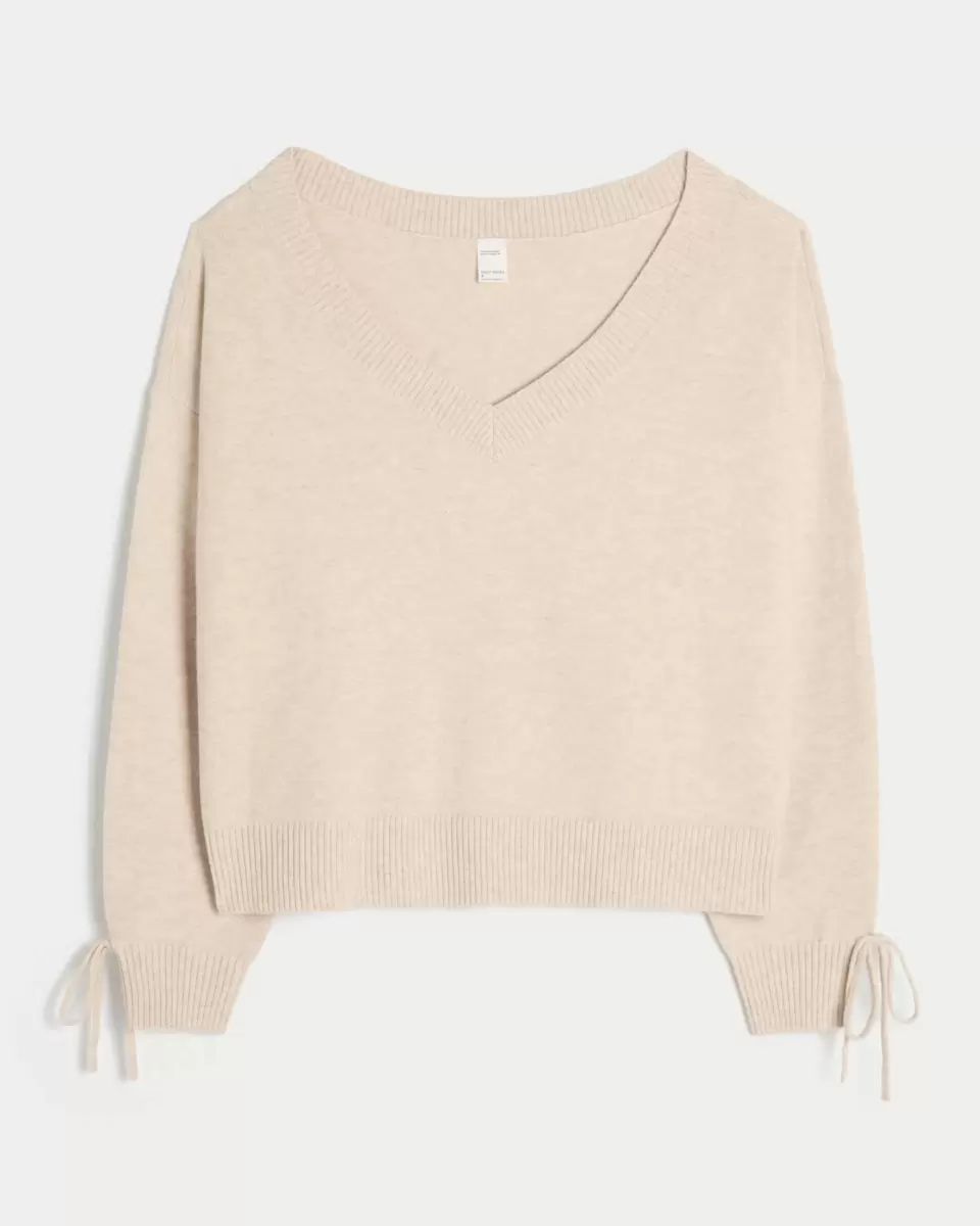 A cozy and super soft sweater with an off-the-shoulder v-neckline and cute bow details at the sleeves. Ribbed trims, long sleeves. Imported.