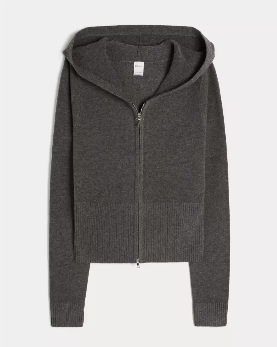 A cozy and super soft sweater hoodie with a dual zipper closure and long sleeves. Ribbed trims. Imported.
