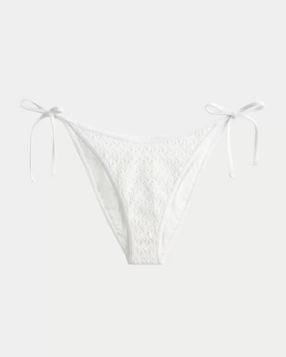 This cute bikini bottom is made with soft crochet-style swim fabric and features sequin details. Side ties, cheeky coverage. Imported.