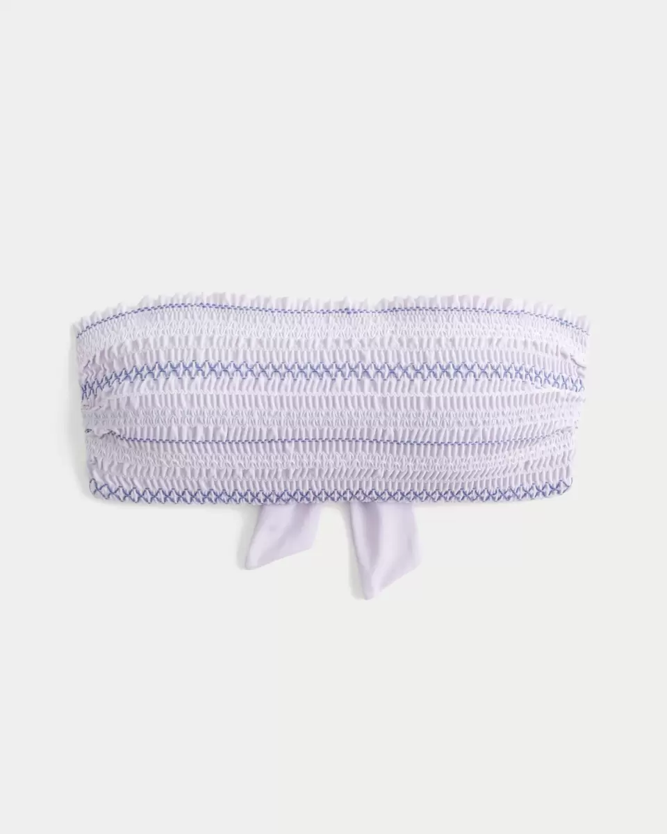 This cute bikini top is designed with a bandeau silhouette and features pop-color stitching. Soft smocked swim fabric, tie closure, removable padding. Imported.