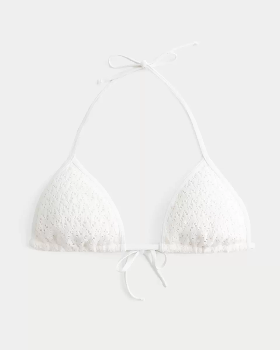 A cute bikini top in soft crochet-style swim fabric, featuring sequin details. Tie closure, halter straps, triangle silhouette, removable padding. Imported.