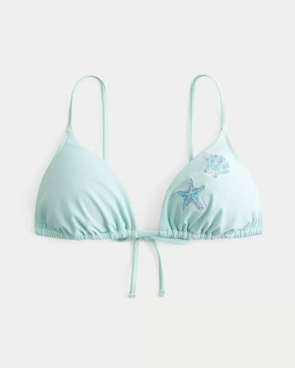 A cute bikini top in a triangle silhouette, featuring adjustable over-the-shoulder straps and embroidered patches with bead details. Tie closure, removable padding. Imported.