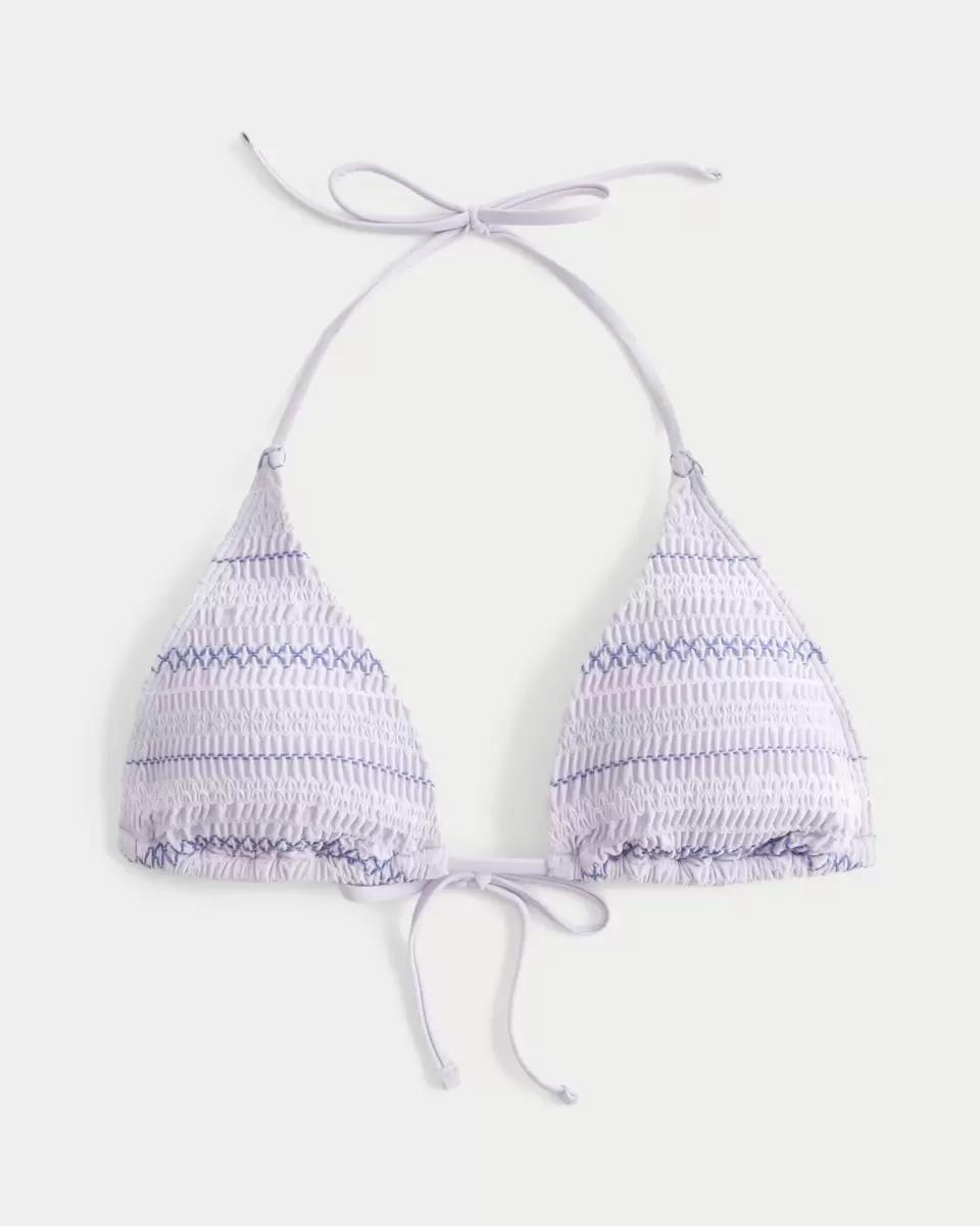 A cute bikini top designed with halter straps and a triangle silhouette. Soft smocked swim fabric with pop-color stitching, tie closure, removable padding. Imported.