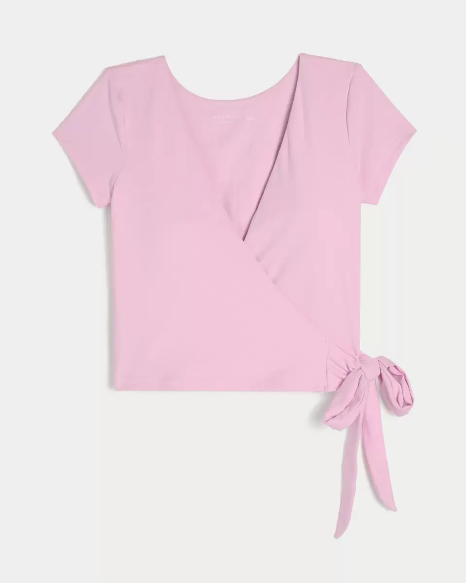 An ultra-comfortable active top designed in our breathable, 4-way stretch, moisture-wicking Recharge fabric with a super soft, brushed feel. Built-in pads, wrap-style silhouette with side tie detail, v-neckline, short sleeves. Imported.