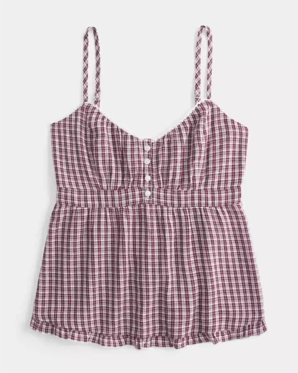 Flowy and super soft, this babydoll top features center button details, scalloped trim along the neckline and a ruffled hem. Adjustable straps. Imported.