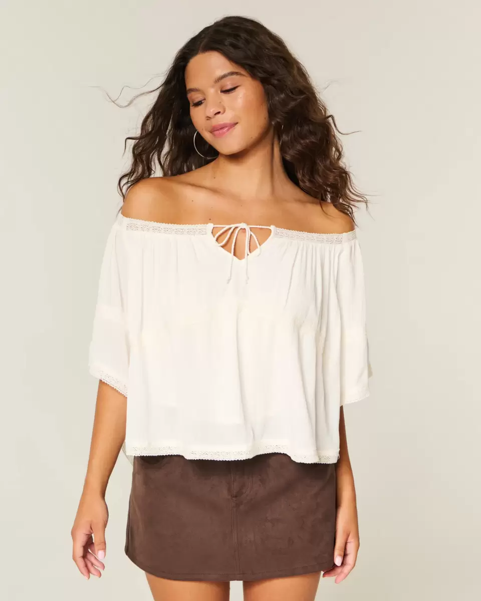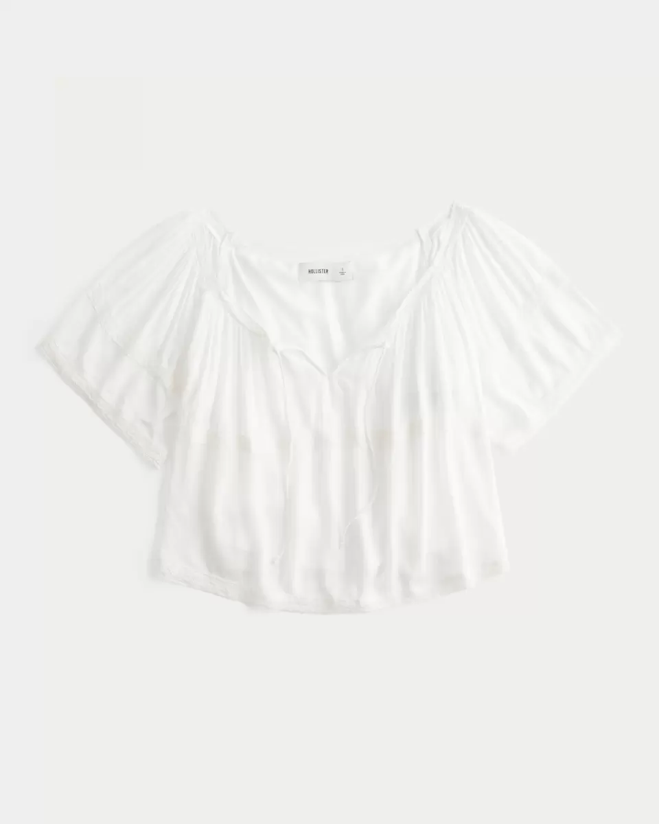 Flowy and super soft, this boho-inspired poncho top is made with crinkle fabric and features pretty lace detailing and a tie detail at the neckline. Short sleeves, looks perfect dressed up or down! Easy Fit. Imported.