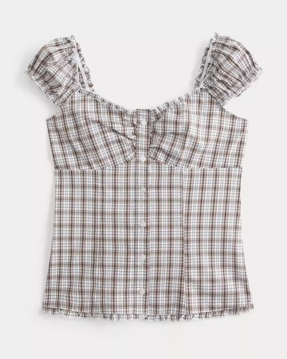 This cute top is made with soft, stretch poplin fabric and features a front button closure and ruffle details. Soft smocked back. Short cap sleeves can be worn on or off the should