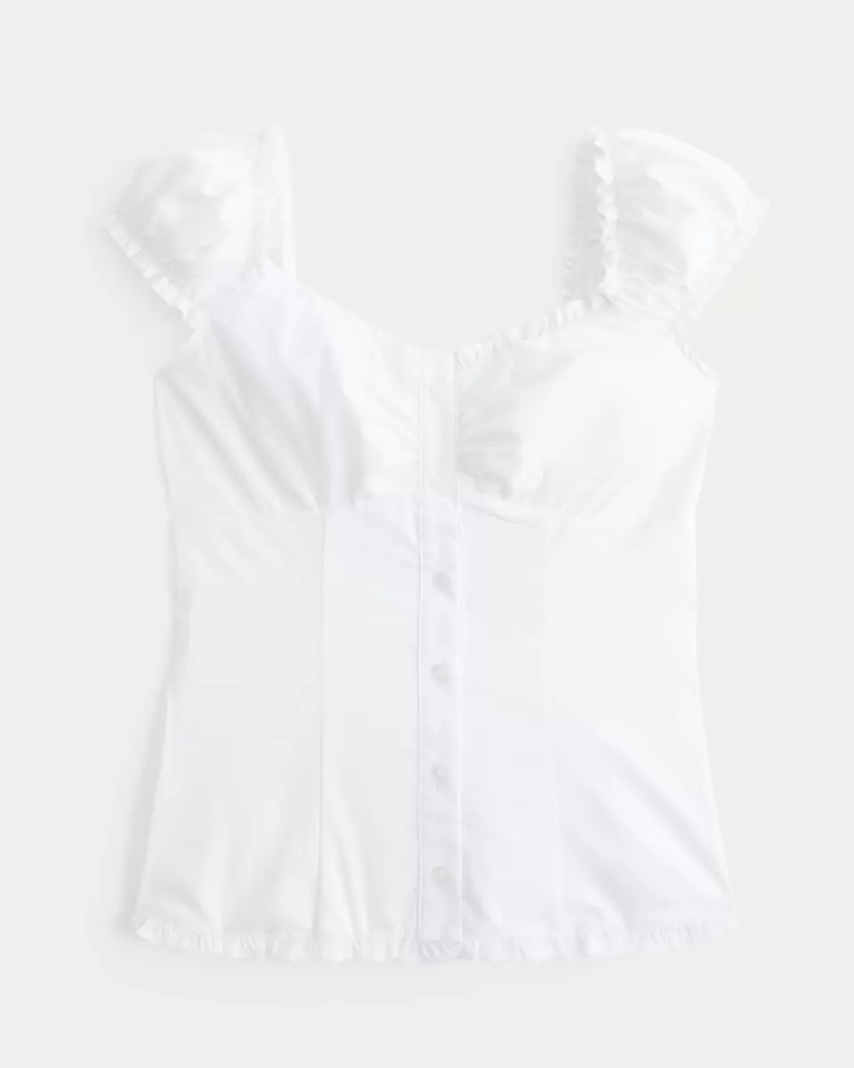 This cute top is made with soft, stretch poplin fabric and features a front button closure and ruffle details. Soft smocked back. Short cap sleeves can be worn on or off the shoulders, looks perfect dressed up or down! Slim Fit. Imported.