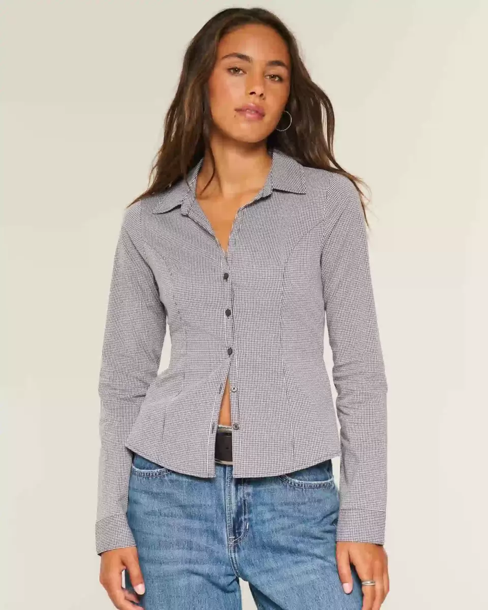 A Y2K-inspired long-sleeve stretch poplin shirt with a full button closure and seaming. Collar, adjustable back tie for the perfect fit. Looks perfect dressed up or down! Slim Fit.