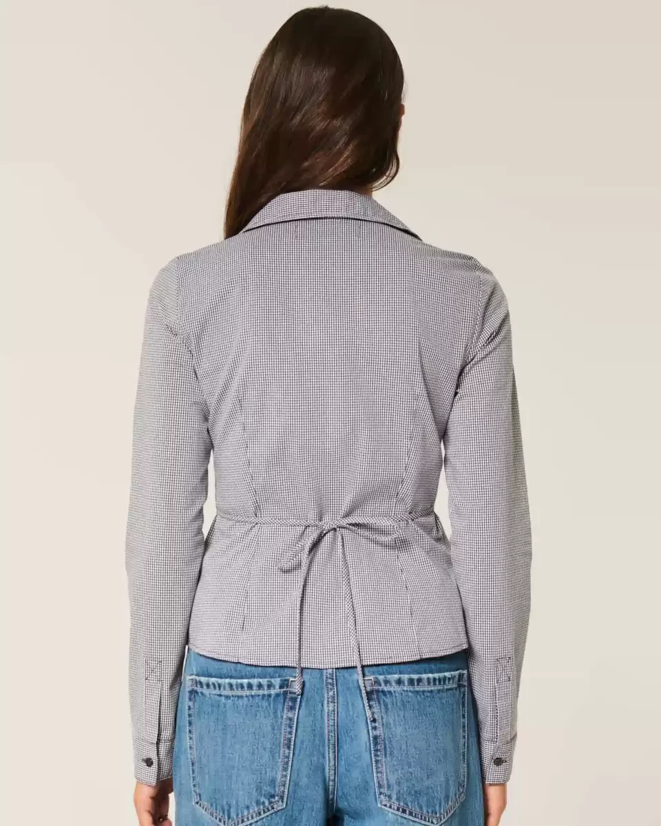 A Y2K-inspired long-sleeve stretch poplin shirt with a full button closure and seaming. Collar, adjustable back tie for the perfect fit. Looks perfect dressed up or down! Slim Fit. Imported.
