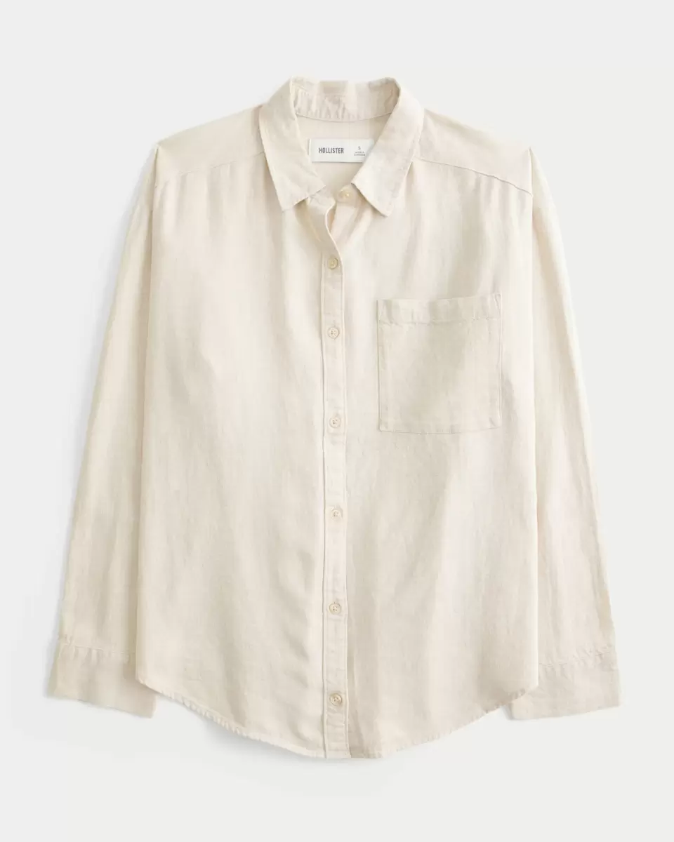 Your new fave shirt is made with a soft linen blend and is designed with a full button closure and left chest pocket. Curved hem, collar. Oversized Fit. Imported.