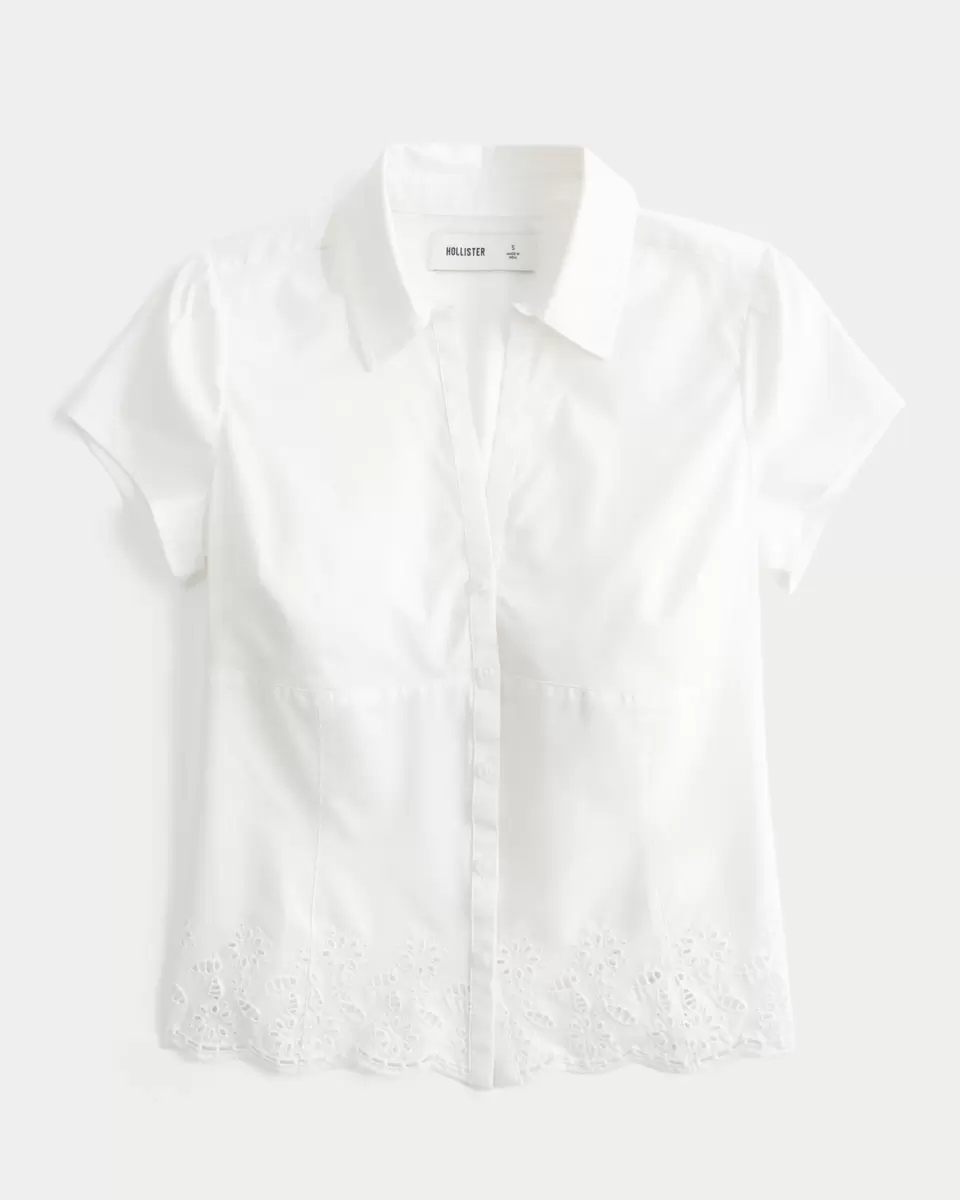 This soft, boho-inspired short-sleeve shirt features eyelet-embroidery along the hem. Collar, stretch poplin fabric. Slim Fit. Imported.
