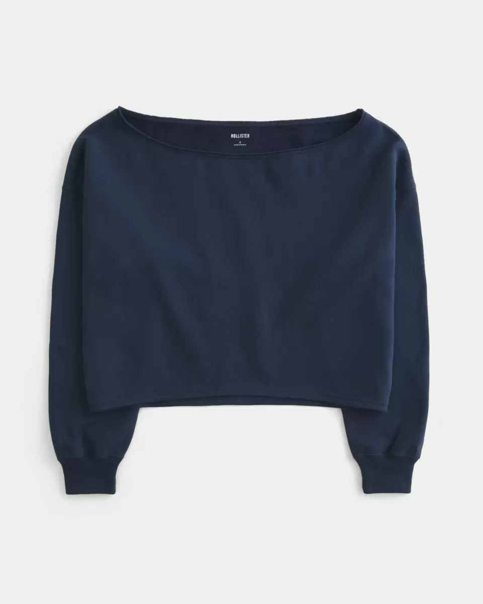 This super soft fleece sweatshirt has a relaxed neckline that can be worn off both shoulders. Long sleeves. Easy Fit. Imported.