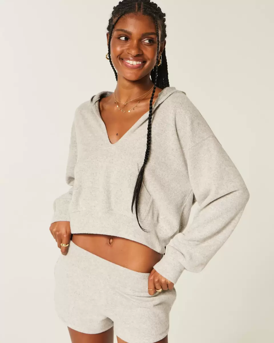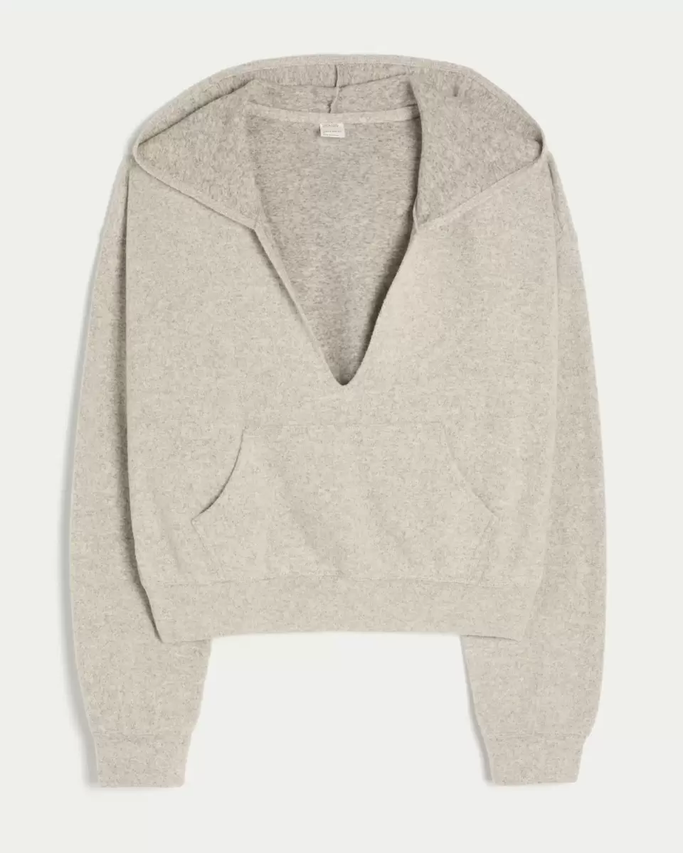 A super soft knit hoodie with a front pouch pocket and deep v-neckline. Hood, long sleeves. Imported.