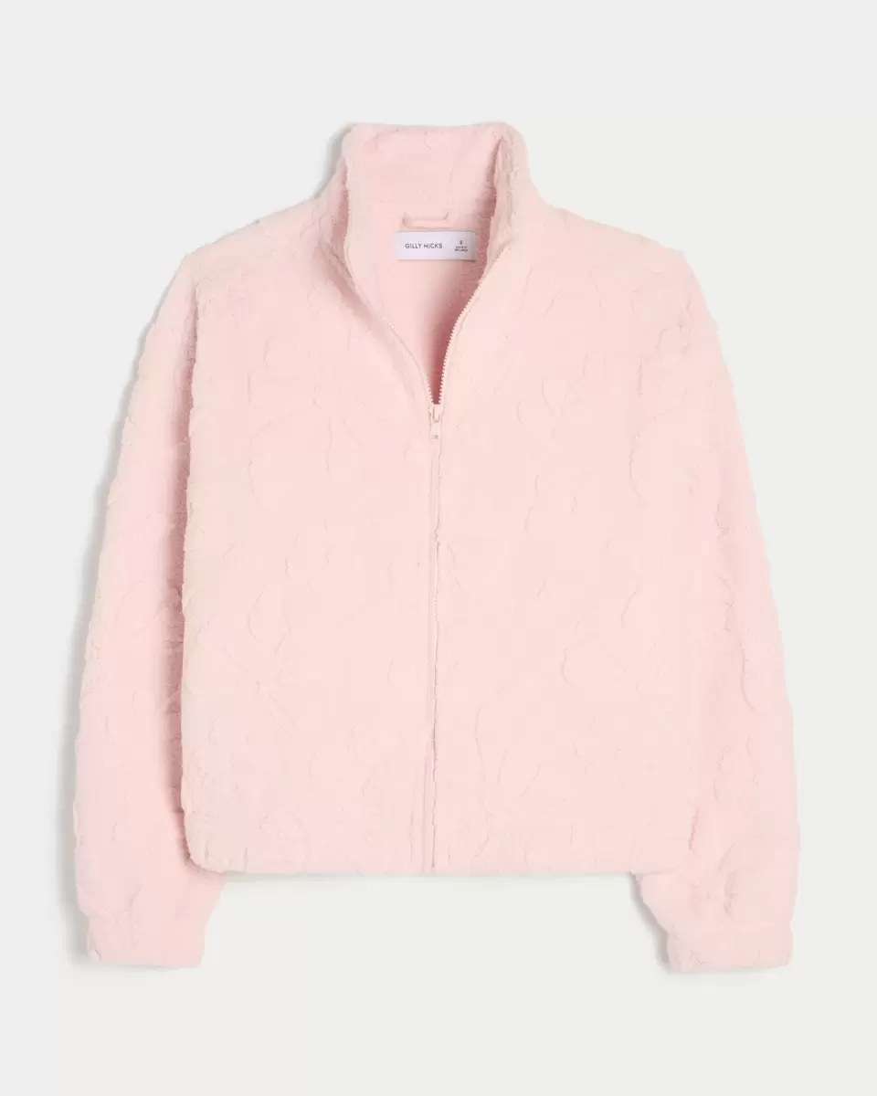 A cozy and super soft top in sherpa fabric featuring all-over patterns. Full zip-up closure, mock-neck collar. Imported.