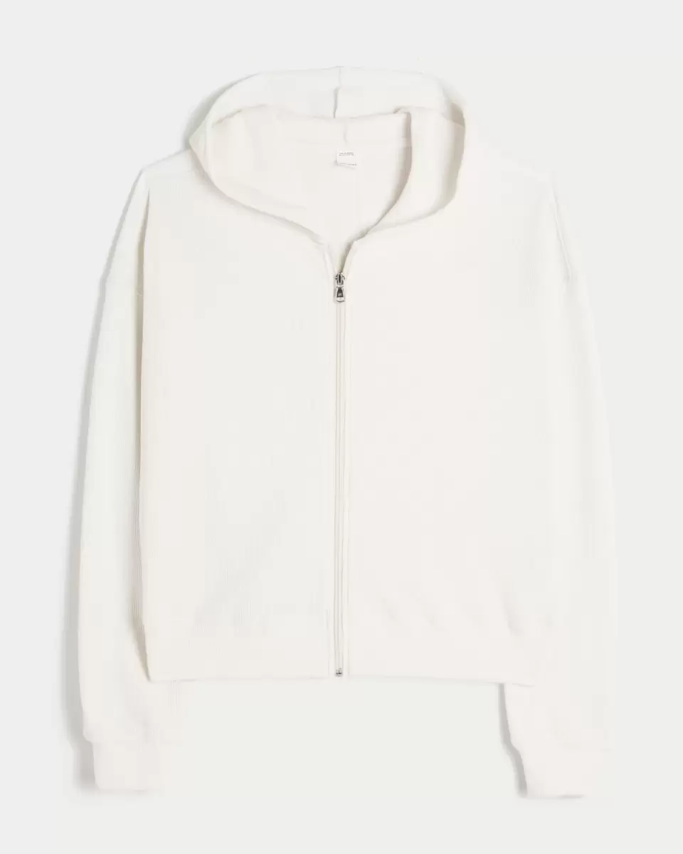 A super soft hoodie in cozy waffle fabric, with a full zip-up closure. Long sleeves, hood. Imported.