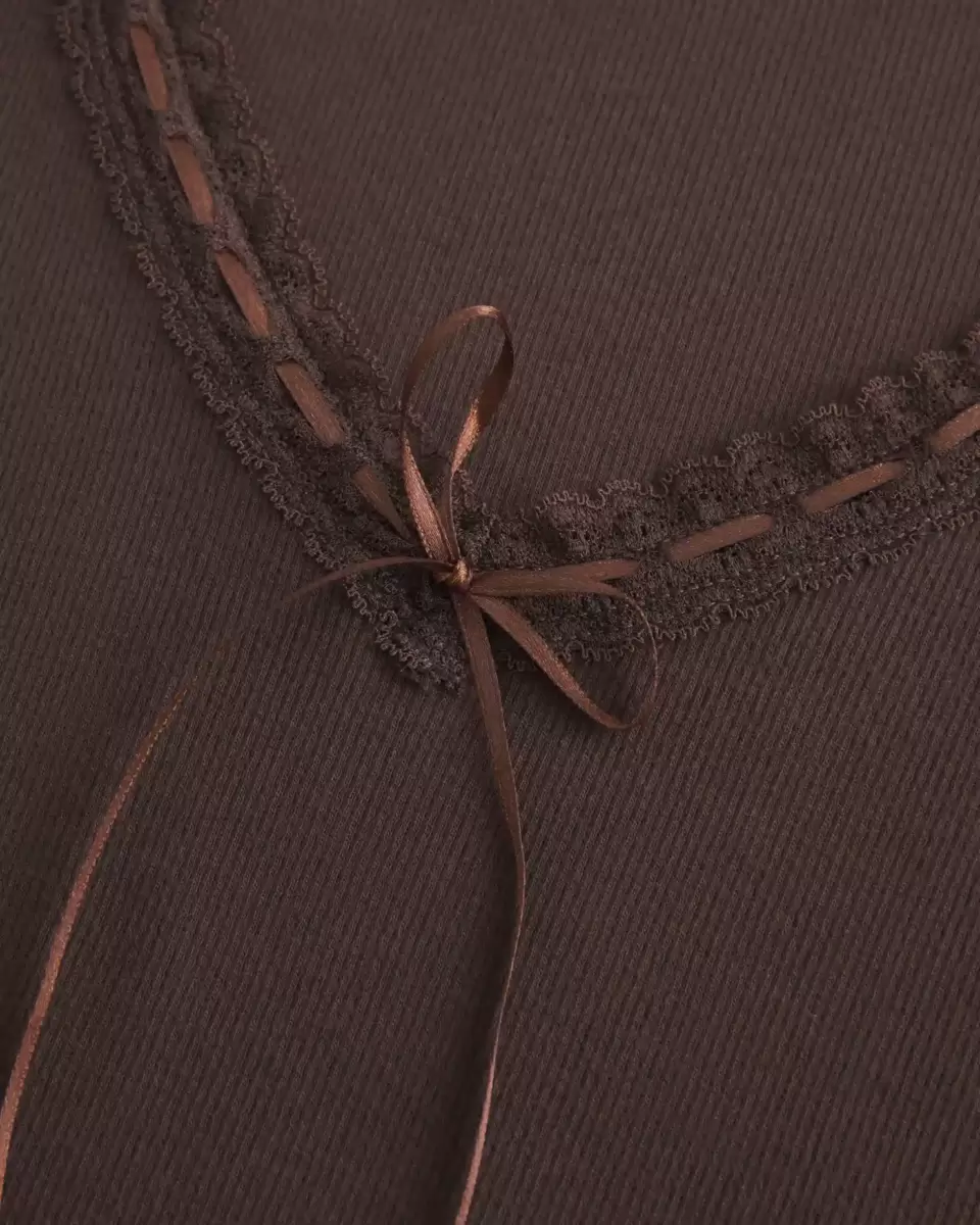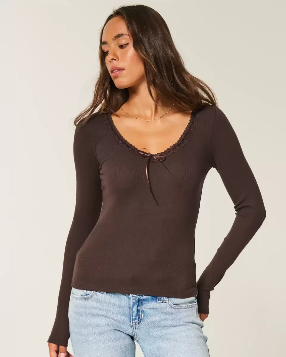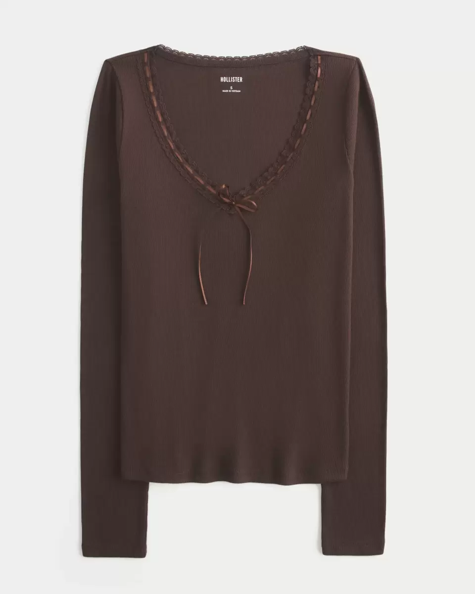 Super soft and comfy, this top features pretty lace trim along the neckline with an interwoven tie detail. Long sleeves. Imported.