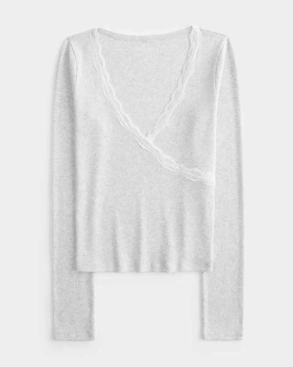 A super soft long-sleeve top featuring a wrap-style v-neckline with pretty lace trim. Slim Fit.