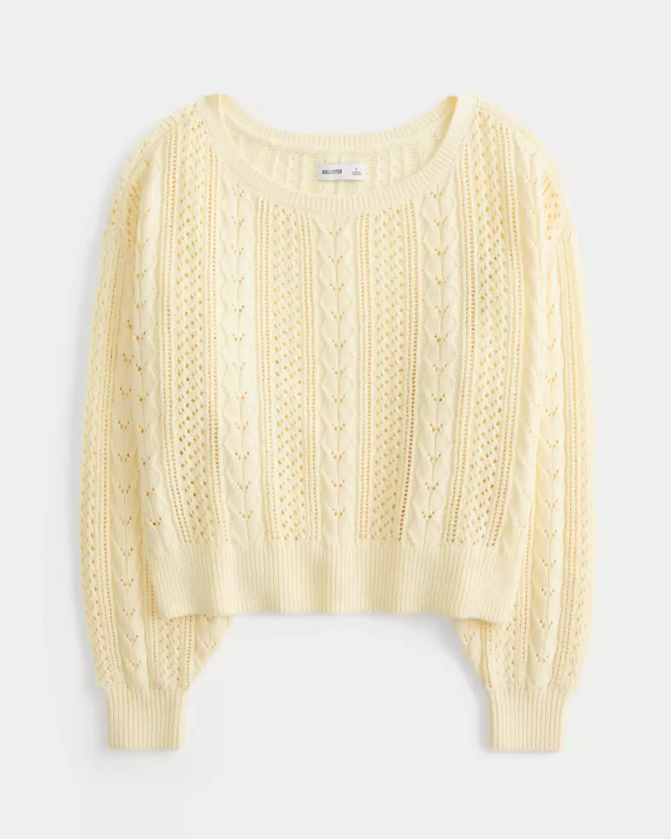 This super soft and cozy sweater features open-stitch cable-knit patterns. Ribbed trims, relaxed neckline, long sleeves. Imported.