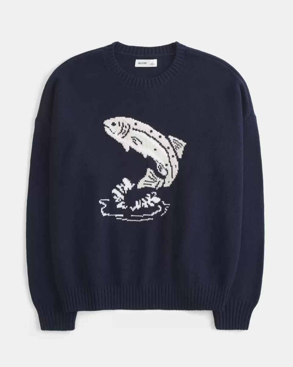 This cozy and super soft sweater features a jumping fish intarsia graphic. Crew neckline, long sleeves, ribbed trims. Easy Fit. Imported.