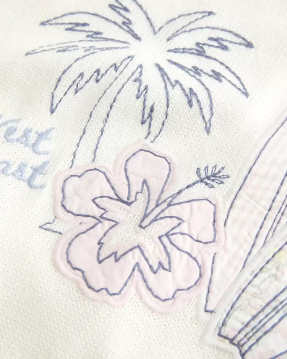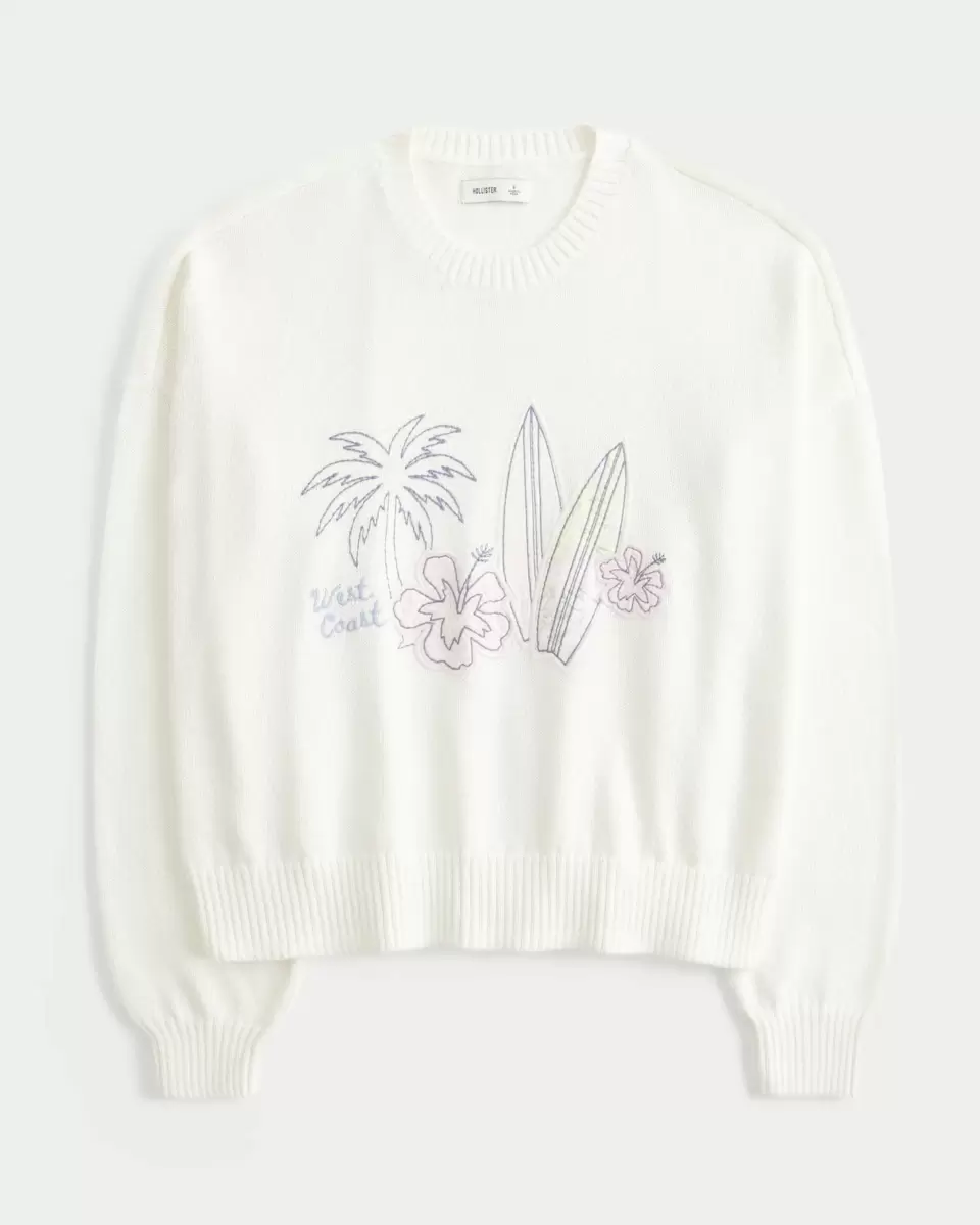 A super soft and cozy sweater featuring West Coast beach graphic embroidery and applique. Crew neckline, long sleeves, ribbed trims. Easy Fit. Imported.