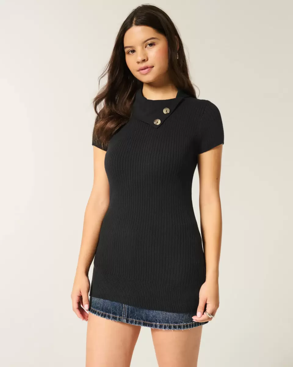 This super soft tunic sweater features a classic asymmetrical collar with buttons and short sleeves. Longer length. Slim Fit. Imported.