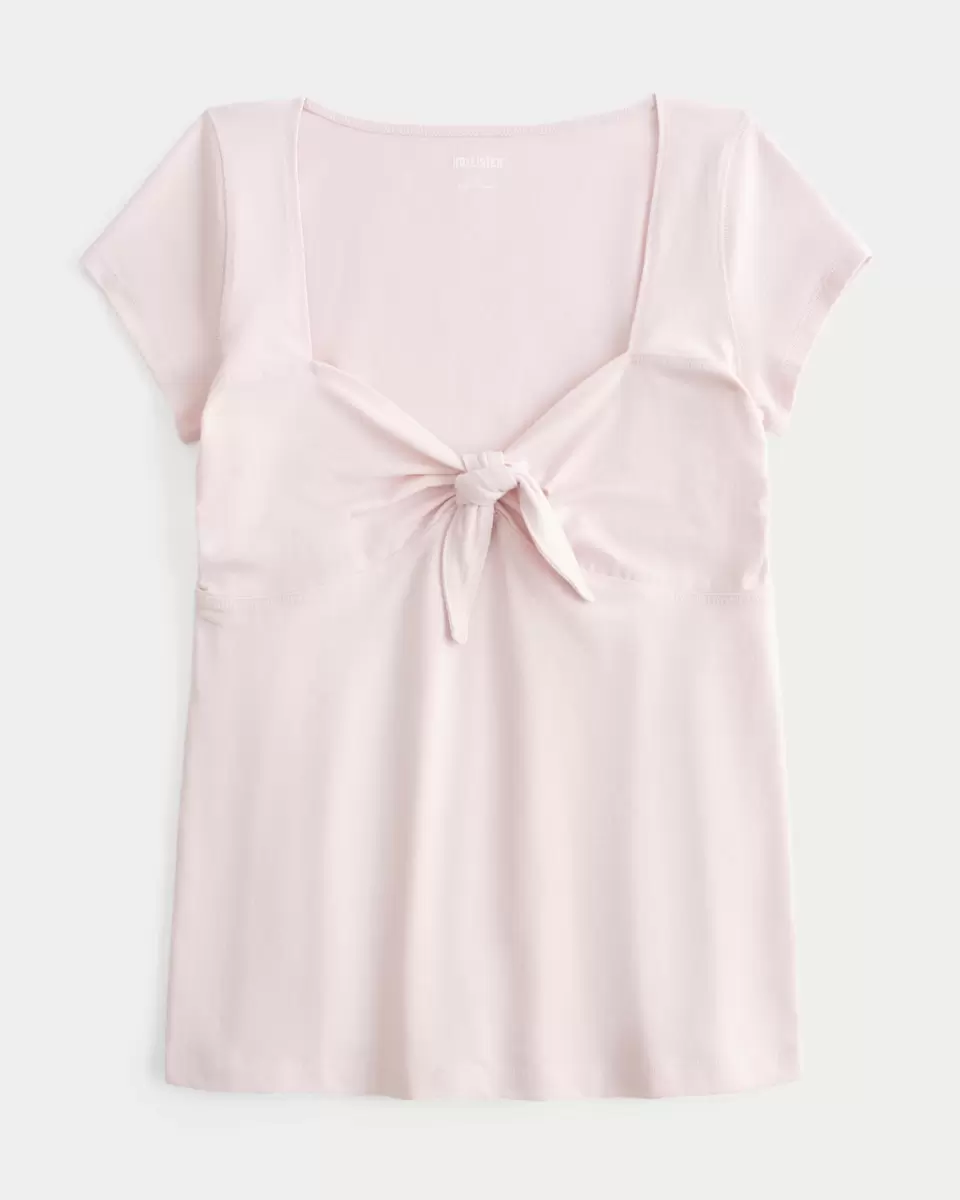 A flowy and super soft babydoll top featuring a cute tie detail at the bust. Short sleeves, longer length. Easy Fit. Imported.